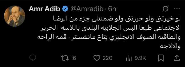 وكتب أديب عبر حسابه الشخصي بموقع إكس: “لو خيرتني ولو حررتني ولو ضمنتلي جزء من الرضا الاجتماعي، طبعًا ألبس الجلابية البلدي باللاسة الحرير والطاقية الصوف الإنجليزي بتاع مانشستر، قمة الراحة والألاجة".