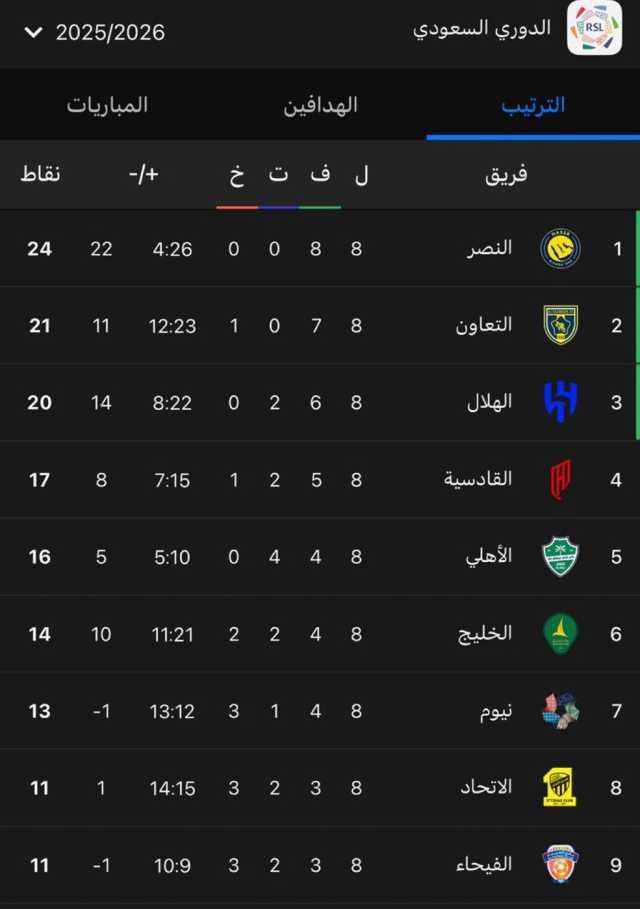 ترتيب الدوري السعودي بعد نهاية الجولة 8 وفوز الأهلي على الاتحاد