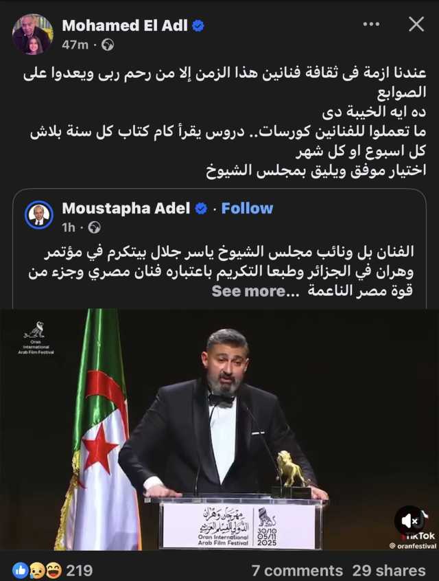 نشر محمد العدل مقطع من تصريحات ياسر جلال خلال المهرجان وأرفقها بتعليق ساخر قائلًا: “عندنا ازمة فى ثقافة فنانين هذا الزمن إلا من رحم ربى ويعدوا على الصوابع“.
