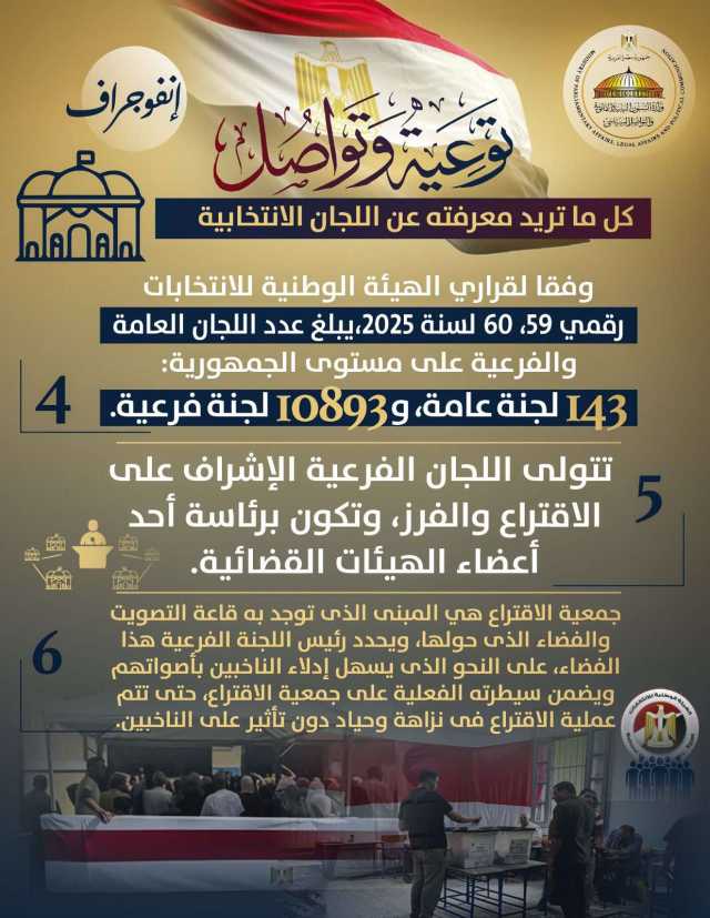 أصدرت وزارة الشؤون النيابية والقانونية بيانًا قالت فيه إنه استمرارًا لحملة توعية وتواصل التي بدأتها الوزارة بالتزامن مع انتخابات مجلس النواب ، نشرت اليوم الأحد ، إنفوجرافات توعية تتعلق باللجان الانتخابية، وكل الأسئلة حولها، بعنوان (توعية وتواصل.. كل ما تريد معرفته عن اللجان الانتخابية.. تشكيل اللجان العامة والفرعية.
