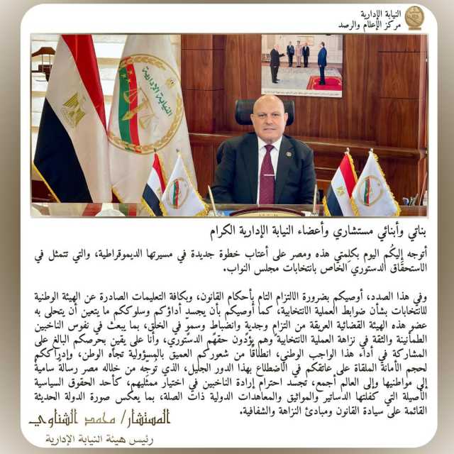 وقال رئيس النيابة الإدارية في رسالته: بناتي وأبنائي أعضاء النيابة الإدارية الكِرَام أَتَوَجه إِليكُم اليَومَ بِكَلِمَتي هَذهِ وَمِصرُ عَلى أَعتَابِ خطوَة جَدِيدَة في مَسيرَتِها الديموقراطية، والتي تتمثل في الاستحقاقِ الدِستوري الخَاص بانتخابات مجلس النواب .
