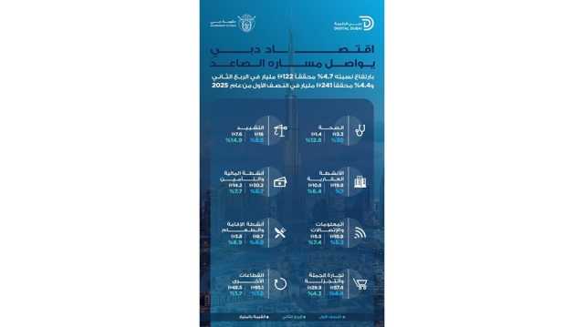 وبلغت نسبة نموّه في النصف الأول من العام الجاري 5.3%، مساهماً بـ 4.5% في الناتج المحلي الإجمالي، حيث بلغت قيمته المضافة 10.8 مليار درهم، مقارنةً بـ 10.2 مليار درهم للفترة ذاتها من عام 2024.