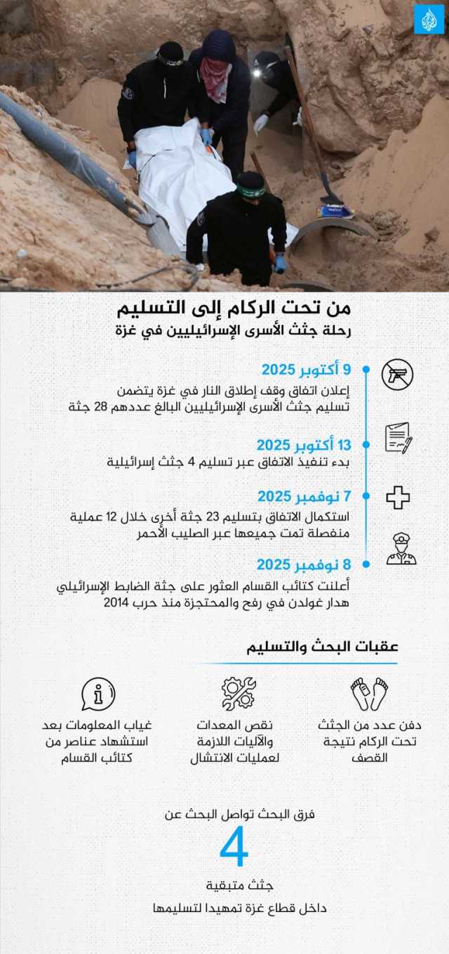 اقرأ أيضا list of 2 itemslist 1 of 2من خيمة النزوح إلى لائحة الناجحين.. رغد مهنّا تهزم الحرب في غزةlist 2 of 2"أغمضي عينيك يا هند".. وثائقي يروي ساعات الرعب الأخيرة للطفلة هند رجبend of listوفي 8 نوفمبر/تشرين الثاني 2025، أعلنت كتائب القسام أنها انتشلت جثة الضابط الإسرائيلي هدار غولدن في رفح جنوب القطاع، وهي محتجزة منذ حرب 2014، ولا تزال فرق البحث تواصل العمل للعثور على 4 جثث متبقية تمهيدا لتسليمها.