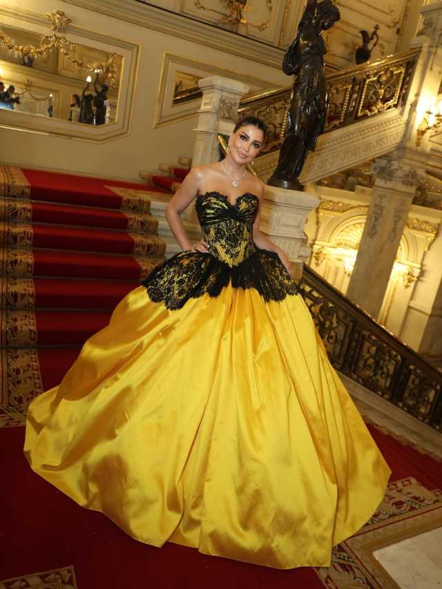 و خطفت الأنظار بإطلالة ملكية أبهر حاضري الحفل، مرتدية فستانًا فخمًا ممزوجًا بين الأصفر الذهبي الصارخ والأسود، بتصميم يجمع بين الأناقة والرقي.
