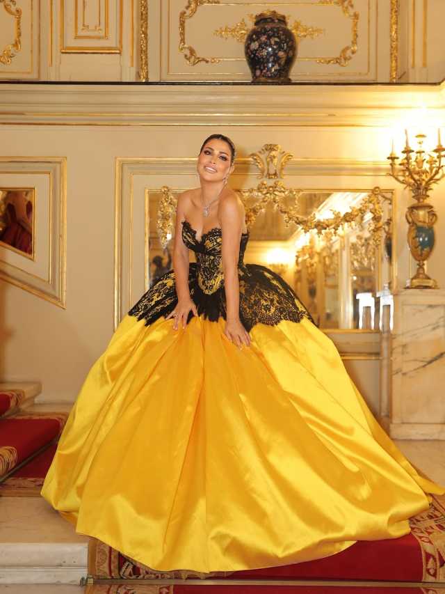 وجاء الجزء العلوي من الفستان مصنوعًا من الدانتيل الأسود الفاخر على شكل زخارف أنيقة، مع ياقة على شكل قلب (كورسيه) أبرزت جمال قوامها برقي، أما الجزء السفلي فكان واسعًا ومنفوشًا بطبقات من القماش اللامع باللون الأصفر الزاهي، مما منح الإطلالة طابعًا ملكيًا متكاملًا يليق بأجواء الحفل الفخم.