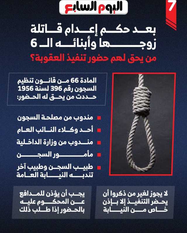من يحضر تنفيذ العقوبة؟.. بعد حكم إعدام قاتلة زوجها وأبنائه الـ6.. إنفوجراف