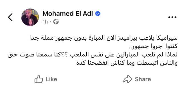 وعبّر محمد العدل عن رأيه في منشور عبر حسابه الشخصي على موقع التواصل الاجتماعي فيسبوك، قائلًا: "سيراميكا يلاعب بيراميدز الآن، المباراة بدون جمهور مملة جدًا… كنتوا أجروا جمهور.