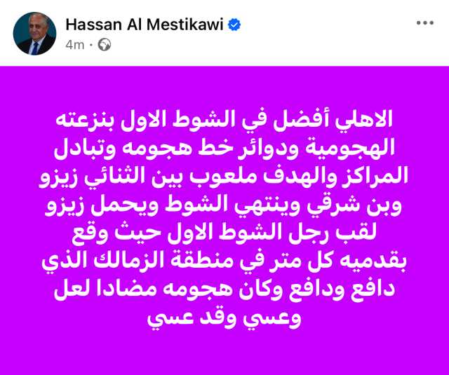 وكتب المستكاوي، عبر حسابه الرسمي على فيسبوك: “الأهلي أفضل في الشوط الأول بنزعته الهجومية ودوائر خط هجومه وتبادل المراكز، والهدف ملعوب بين الثنائي زيزو وبن شرقي، وينتهي الشوط ويحمل زيزو لقب رجل الشوط الأول حيث وقع بقدميه كل متر في منطقة الزمالك الذي دافع ودافع وكان هجومه مضادًا لعل وعسى وقد عسى".