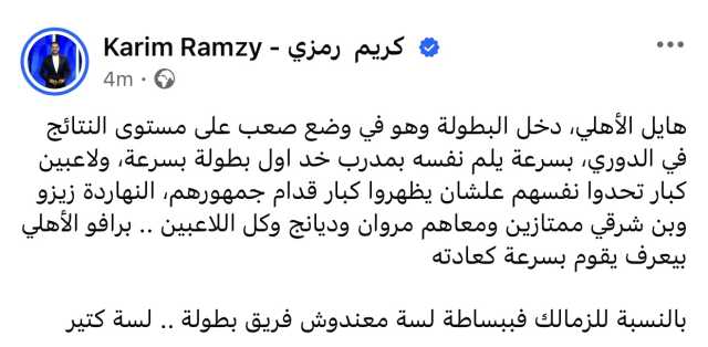 وكتب رمزي عبر حسابه الرسمي على فيسبوك: “هايل الأهلي، دخل البطولة وهو في وضع صعب على مستوى النتائج في الدوري، بسرعة يلم نفسه بمدرب خد أول بطولة بسرعة، ولاعبين كبار تحدوا نفسهم علشان يظهروا كبار قدام جمهورهم.
