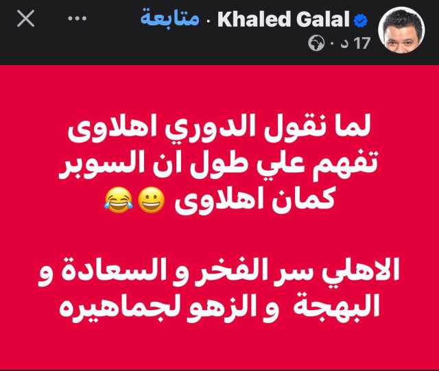 أعرب الفنان خالد جلال عن سعادته بتتويج النادي الأهلي بلقب السوبر المصري، مؤكدًا أن إنجازات الفريق أصبحت مصدر فخر وسعادة لجماهيره العريضة.