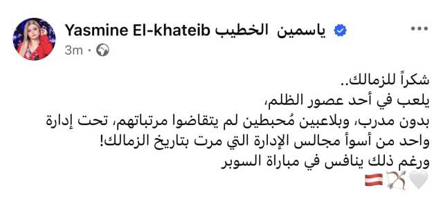وكتبت الخطيب عبر حسابها الرسمي على فيسبوك: “شكراً للزمالك.. يلعب في أحد عصور الظلم، بدون مدرب، وبلاعبين مُحبطين لم يتقاضوا مرتباتهم، تحت إدارة واحد من أسوأ مجالس الإدارة التي مرت بتاريخ الزمالك! ورغم ذلك ينافس في مباراة السوبر".