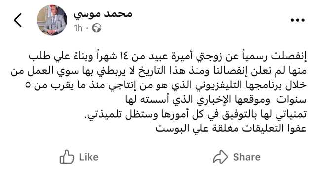 وكتب محمد موسى عبر حسابه الشخصي بموقع فيسبوك: "انفصلت رسمياً عن زوجتي أميرة عبيد من ١٤ شهراً وبناءً علي طلب منها لم نعلن انفصالنا ومنذ هذا التاريخ لا يربطني بها سوي العمل من خلال برنامجها التليفزيوني الذي هو من إنتاجي منذ ما يقرب من ٥ سنوات وموقعها الإخباري الذي أسسته لها تمنياتي لها بالتوفيق في كل أمورها وستظل تلميذتي.