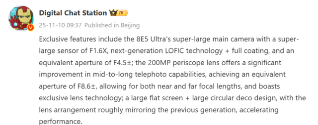لكن أبرز ما يميز هذا الهاتف هو عدسة مقربة بدقة 200 ميجابكسل، قادرة على تقريب فائق للمدى المتوسط والبعيد بفتحة عدسة فعّالة تقترب من f/8.6. وستستخدم هذه العدسة
