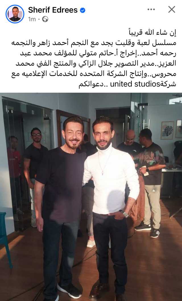 نشر الفنان شريف إدريس، عبر صفحته علي موقع التواصل الإجتماعي فيسبوك، صورة تجمعه بالفنان أحمد زاهر من كواليس مسلسلهما الجديد.