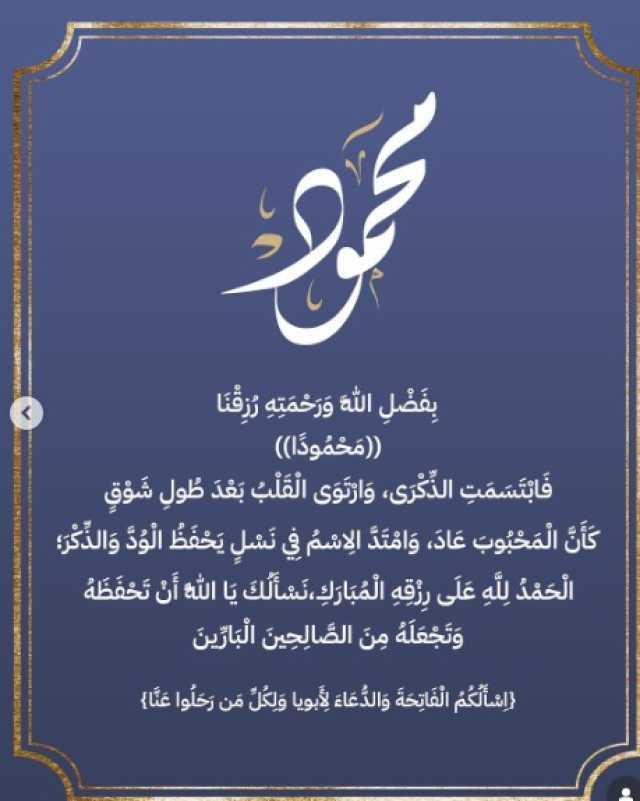 كشف الفنان محمد نجل الفنان محمود عبد العزيز، أنه رزق بمولود جديد واختار له اسم محمود على اسم والده الراحل.