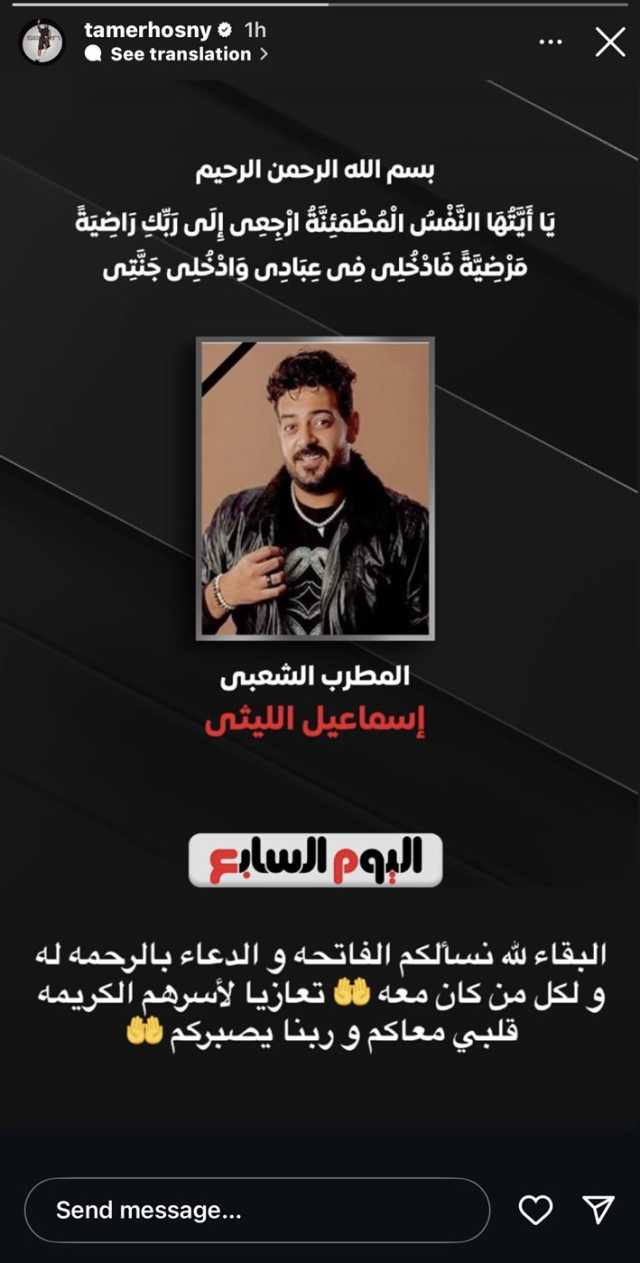 حرص الفنان تامر حسني، على نعي المطرب الراحل إسماعيل الليثي، الذي رحل عن عالمنا منذ قليل، وذلك خلال منشور عبر ستوري حسابه الشخصي بموقع تبادل الصور والفيديوهات “انستجرام”.
