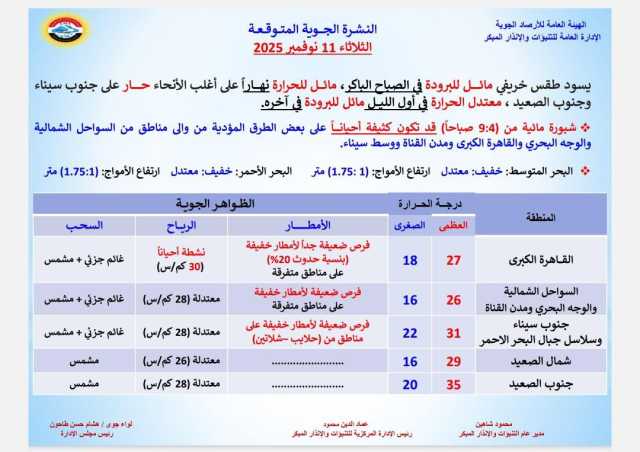 وأشار إلى أن ساعات الليل المتأخر والصباح الباكر تشهد أجواء باردة بشكل ملحوظ، خاصة على القاهرة وشمال الصعيد وسيناء، مؤكدًا ضرورة ارتداء ملابس خريفية خفيفة خلال تلك الفترات.