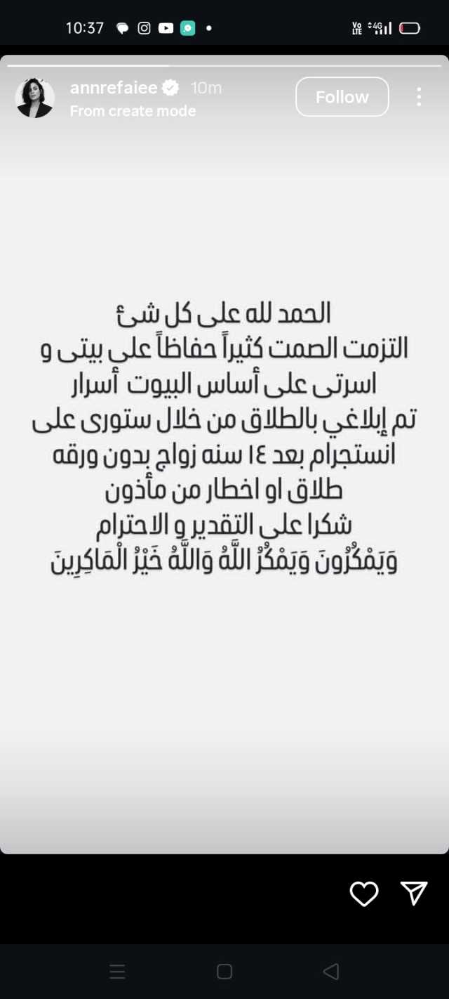 وكتبت “آن الرفاعي”، عبر حسابها الرسمي على “إنستجرام”: “الحمد لله على كل شيء، التزمت الصمت كثيرا حفاظا على بيتي وأسرتي، على أساس البيوت أسرار، تم إبلاغي بالطلاق من خلال ستوري إنستجرام، بعد 14 سنة زواج، وبدون ورقة طلاق أو إخطارا من مأذون، شكرا على التقدير والاحترام.. «ويمكرون ويمكر الله والله خير الماكرين»”.