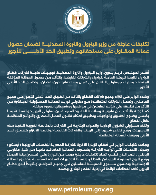 وزير البترول يكلف باتخاذ إجراءات عاجلة لضمان حقوق عمالة المقاول وتطبيق الحد الأدنى للأجور