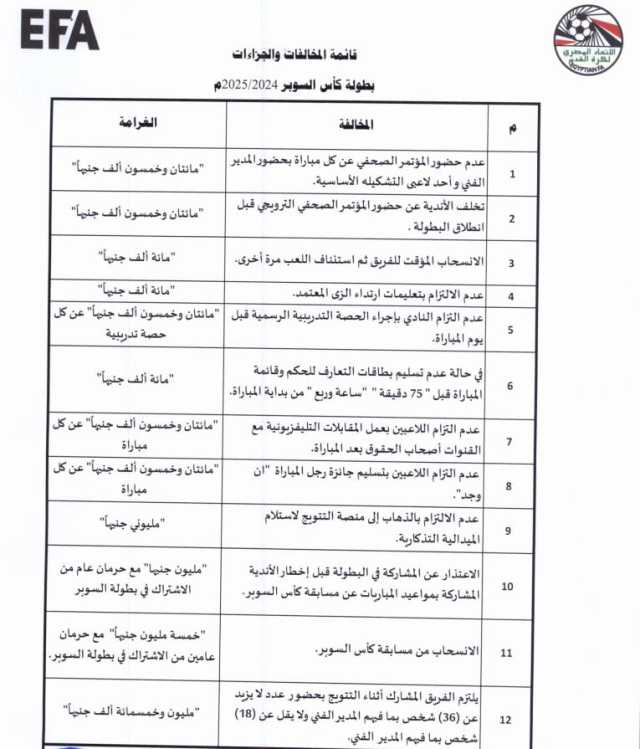 وتنشر “الوفد”، لائحة عقوبات بطولة كأس السوبر، الذي توج الأهلي بلقبه على حساب الزمالك، بعد الفوز بالمباراة 2-0.