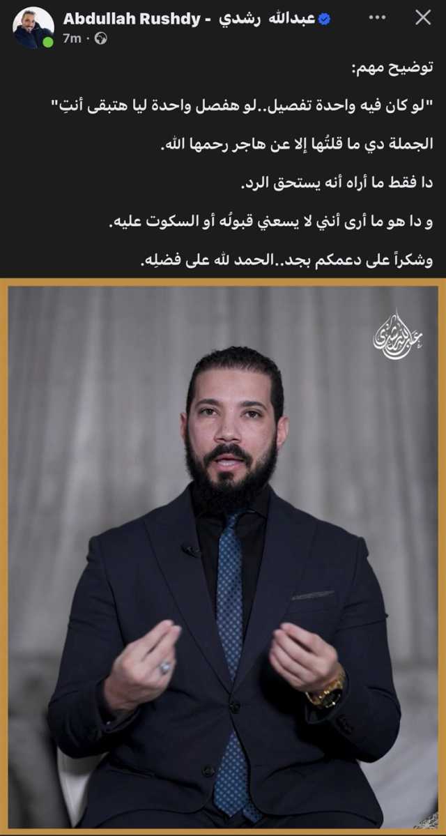 وكتب عبد الله رشدي: "توضيح مهم: "لو كان فيه واحدة تفصيل..لو هفصل واحدة ليا هتبقى أنتِ" … الجملة دي ما قلتُها إلا عن هاجر رحمها الله".