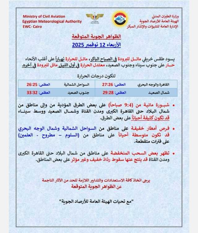 ويبقى التحذير من شبورة مائية قد تكون كثيفة أحياناً صباحاً على بعض الطرق المؤدية من و إلى شمال البلاد حتى القاهرة الكبرى ومدن القناة وشمال الصعيد.
