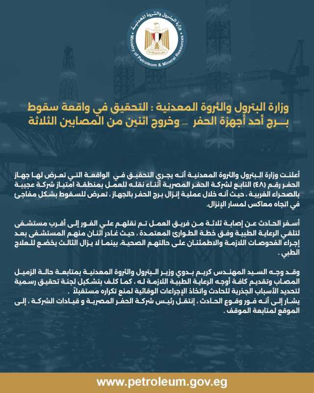 وزارة البترول تكشف تفاصيل حادث جهاز الحفر رقم 48 .. وخطة الرعاية للمصابين