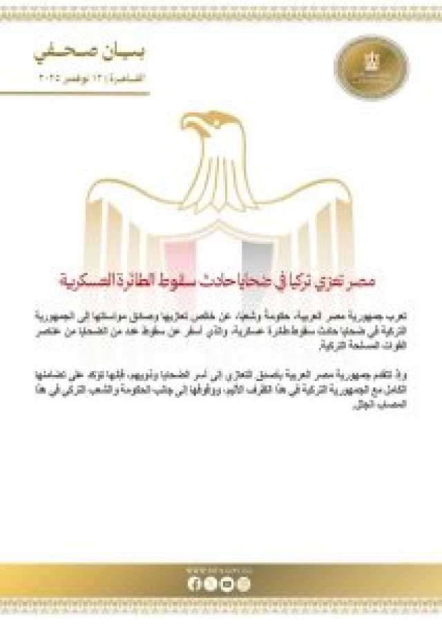 وقال بيان صادر عن وزارة الخارجية المصرية، اليوم الأربعاء، :تعرب جمهورية مصر العربية، حكومة وشعبًا، عن خالص تعازيها وصادق مواساتها إلى الجمهورية التركية في ضحايا حادث سقوط طائرة عسكرية، والذي أسفر عن سقوط عدد من الضحايا من عناصر القوات المسلحة التركية”.
