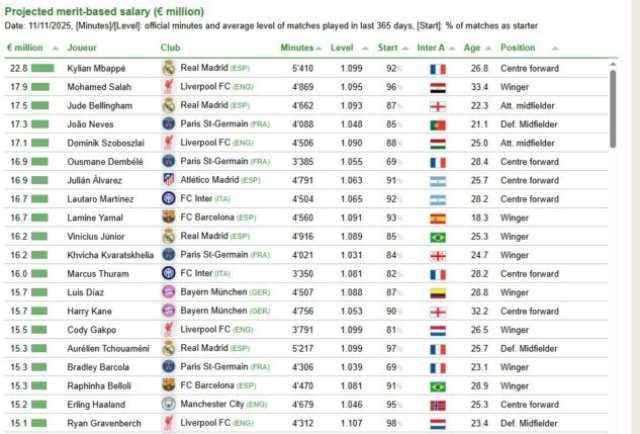 وفيما يلي قائمة أعلى 10 لاعبين استحقاقًا للرواتب في العالم لعام 2025 بحسب المرصد الدولي لكرة القدم (CIES):