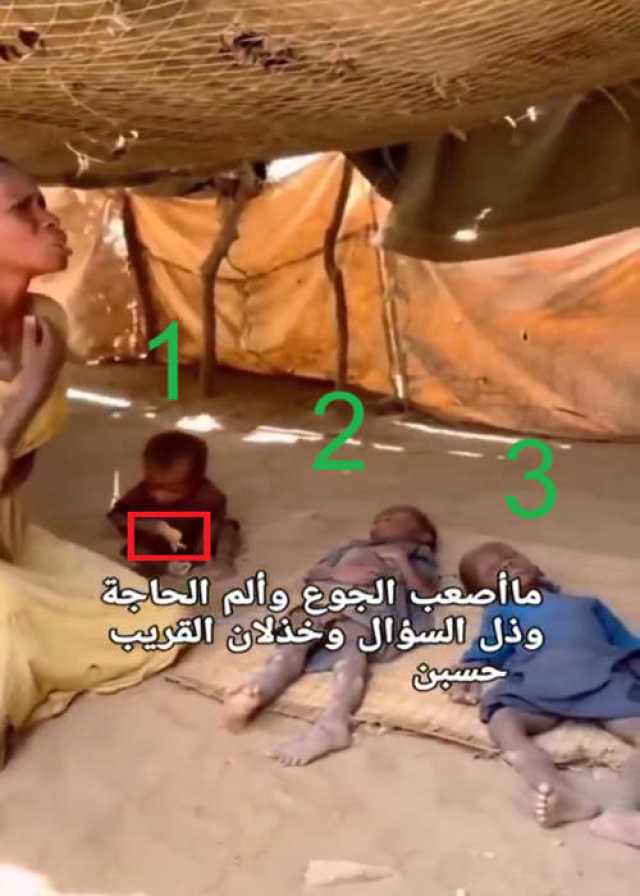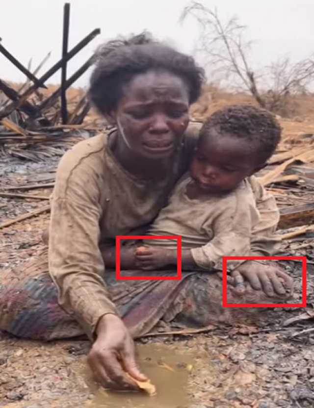 أما في فيديو الأم التي كانت تجلس على أرض رطبة وتغمس الطعام في بركة مياه ضحلة، كانت أطراف السيدة وطفلها مقتطعة.