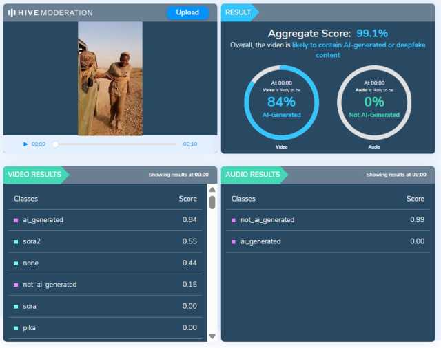 كما بيّنت نتائج أدوات تقنية متخصصة في تدقيق المواد المصورة، منها اداة Hive Moderation، أن المقاطع مُنتجة بالذكاء الاصطناعي.