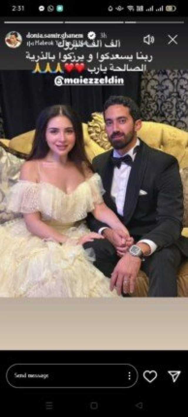 وشاركت دنيا سمير غانم، عبر حسابها الرسمي بموقع تداول الصور والفيديوهات «إنستجرام»، معلقة عليها قائلة: «ألف ألف مبروك، ربنا يسعدكوا ويرزقوا بالذرية الصالحة».