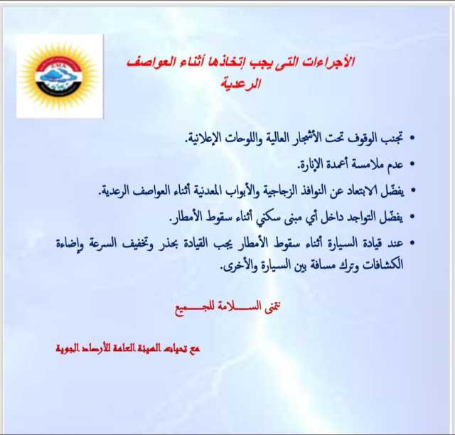 حذرت هيئة الأرصاد من حالة من عدم الاستقرار في الأحوال الجوية على شمال البلاد ، حيث متوقع تكاثر السحب المنخفضة والمتوسطة والركامية على مناطق من شمال البلاد يصاحبها سقوط أمطار متفاوتة الشدة تكون رعدية أحيانا، وتزداد شدتها على السواحل الشمالية وشمال الوجه البحرى تقل حدتها كلما تقدمنا للمناطق الداخلية.