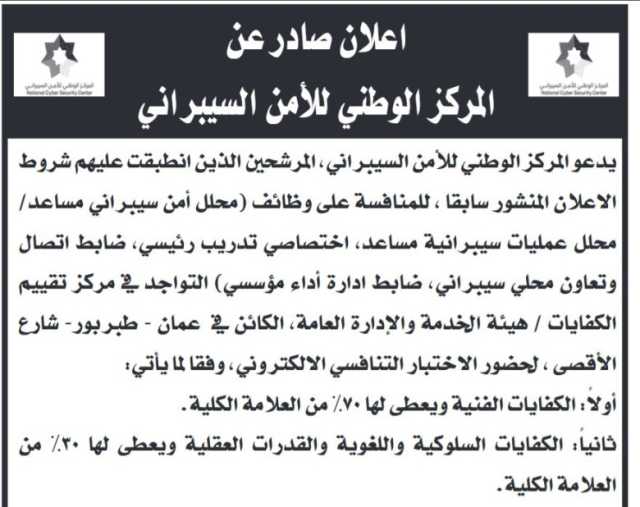كلمات دلالية: سواليف المركز الوطني للامن السيبراني الامتحان التنافسي
