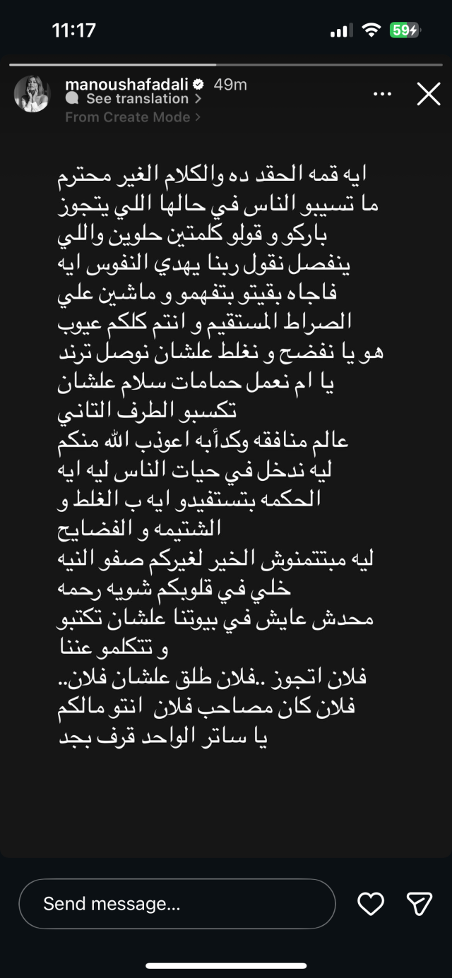 وكتبت منة فضالي عبر خاصية الاستوري: “ايه قمة الحقد دة والكلام الغير محترم ما تسيبوا الناس في حالها اللي يتجوز باركوا وقولوا كلمتين حلوين، واللي ينفصل نقول ربنا يهدي النفوس”.