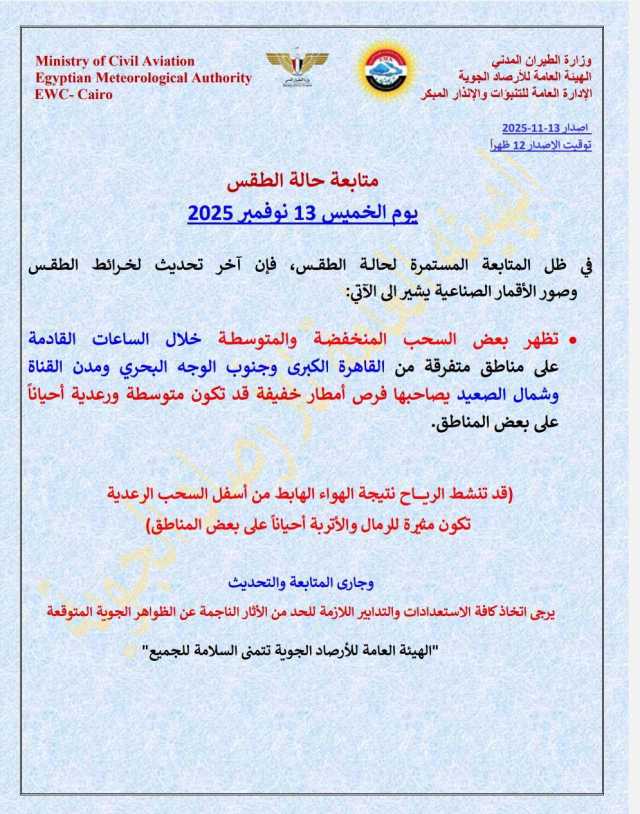 أعلنت الهيئة العامة لـ الأرصاد الجوية تفاصيل حالة الطقس والظواهر الجوية المتوقعة اليوم الخميس 13 نوفمبر 2025.