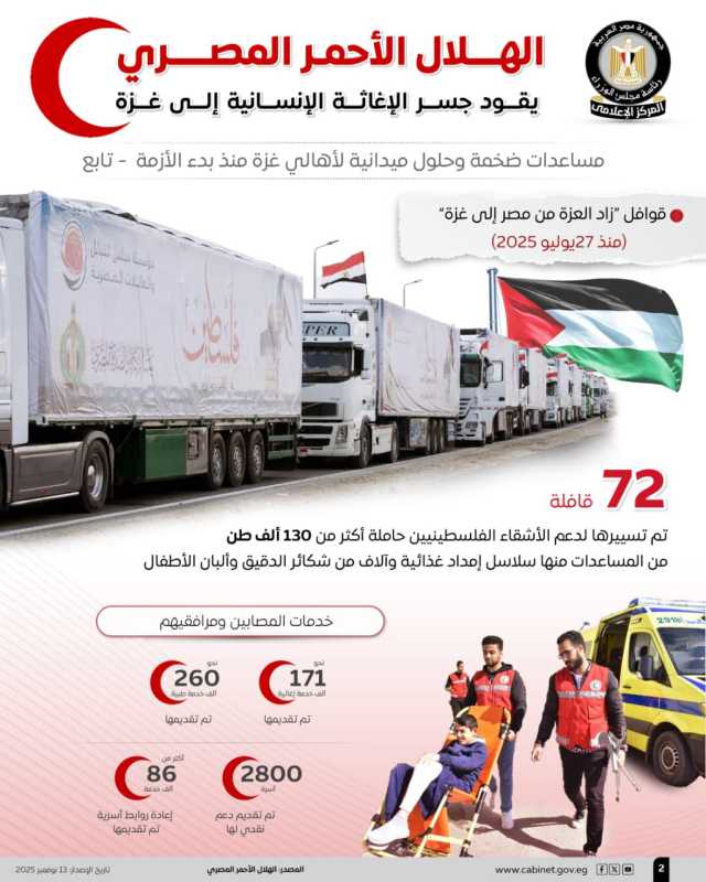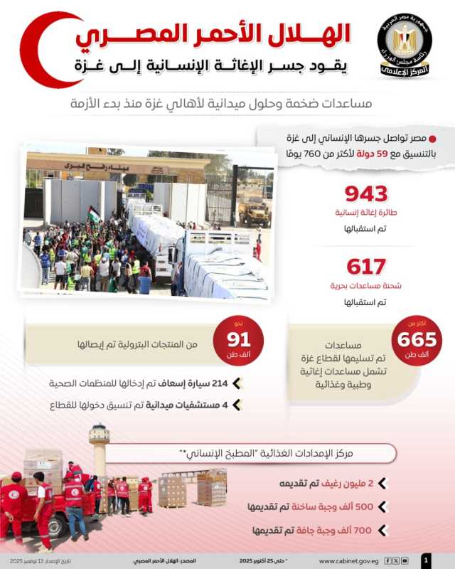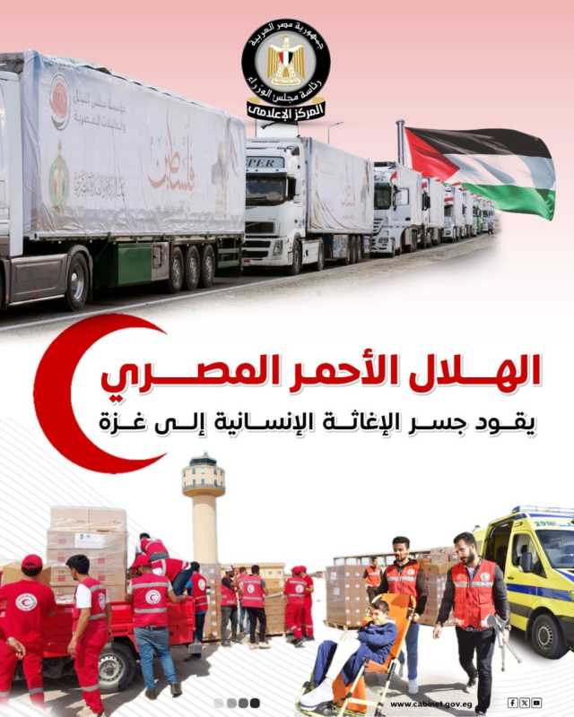 نشر المركز الإعلامي لمجلس الوزراء عددًا من الإنفوجرافات عبر منصاته على مواقع التواصل الاجتماعي، سلط من خلالها الضوء على جهود الهلال الأحمر المصري في تقديم المساعدات الإنسانية إلى قطاع غزة.