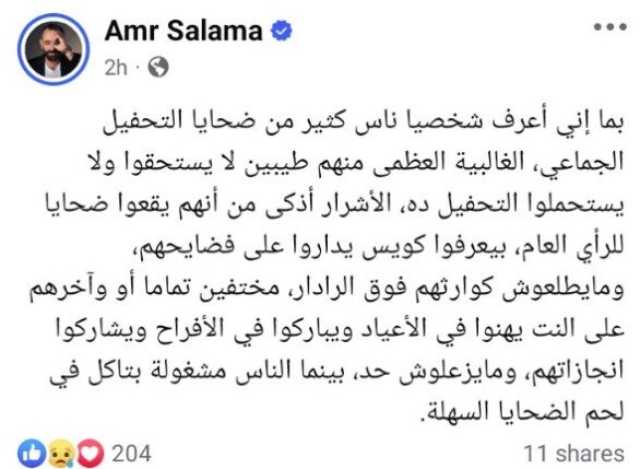 وأعرب عمرو سلامة، عبر حسابه الرسمي بموقع تداول الصور والفيديوهات «إنستجرام»، عن استيائه قائلا: «بما إني أعرف شخصيا ناس كثير من ضحايا التحفيل الجماعي، الغالبية العظمى منهم طيبين لا يستحقوا ولا يستحملوا التحفيل ده».