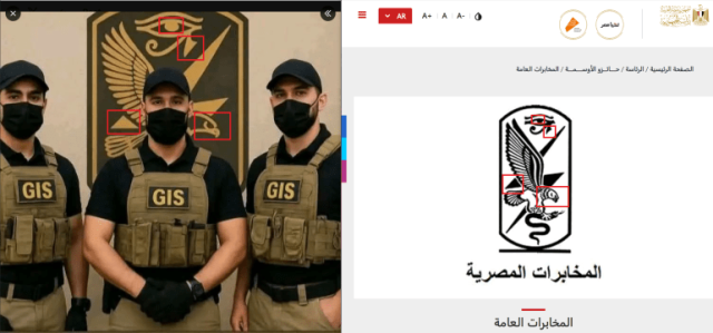 لكن بعد التدقيق البصري ومطابقة الصورة المتداولة، التي وُضع خلفها شعار المخابرات العامة المصرية، يتبيّن وجود اختلافات كبيرة مع الشعار الأصلي المنشور على موقع رئاسة الجمهورية، تتضمن "شكل العين وهيئة المنقار والرأس وعدد الأجنحة"، كما أن السلطات المصرية لم تعلن ذلك رسميًا، مما دفعنا للتشكيك في صحة الصورة.