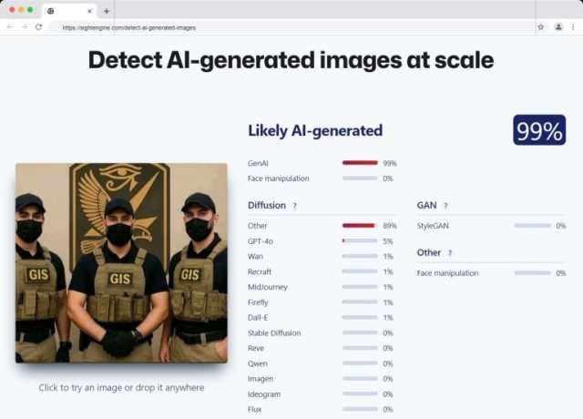 وأظهرت أداة متخصصة في كشف الصور المولدة بالذكاء الاصطناعي أن الصورة مزيفة بنسبة تبلغ 99%، مما يؤكد أنها معدّلة وليست حقيقية.