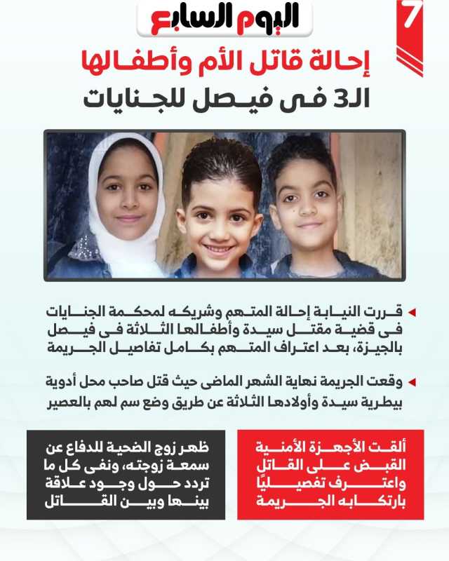 إحالة قاتل الأم وأطفالها الـ3 فى فيصل لمحكمة الجنايات.. انفوجراف