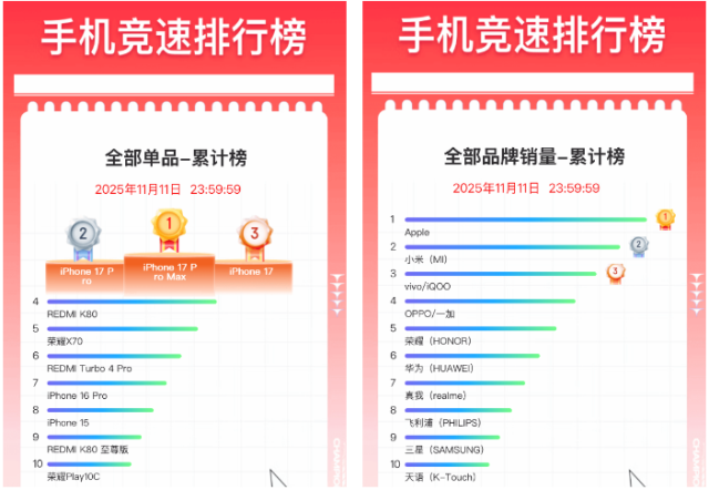 اختتم مهرجان التسوق الصيني Double 11، وأكدت شركة JD.com تصنيف مبيعات الهواتف الذكية النهائية، تصدرت آبل، تلتها شاومي وفيفو المراتب الثلاثة الأولى من حيث إجمالي الوحدات المباعة حتى مساء يوم 11 نوفمبر، ما يعكس استمرار هيمنة آبل وأداء قوي للعلامات الصينية الكبرى.