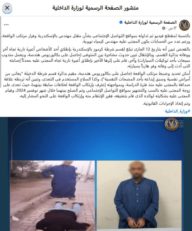علقت #وزارة_الداخلية_المصرية على واقعة #مقتل #مهندس في مدينة #الإسكندرية بالرصاص، وانتشار مزاعم بأنه مهندس كيمياء نووية، مؤكدة أن #الجريمة جاءت نتيجة مشاجرة مع القاتل.