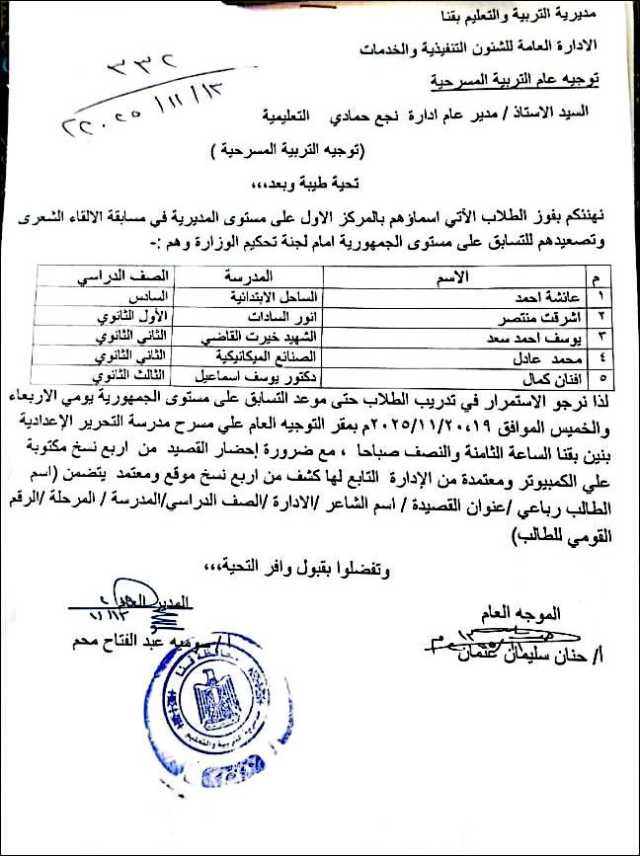 وأسفرت نتيجة المسابقة، عن فوز 5 طلاب بمدارس إدارة نجع حمادي التعليمية، بمختلف المراحل، من المشاركين في منافسات المسابقة، بالمركز الأول علي مستوي المديرية، وتصعيدهم للتسابق علي مستوي الجمهورية، أمام لجنة تحكيم الوزارة، في المواعيد المحددة بصباح يومي الأربعاء والخميس الموافقين 19 و 20 /11 2025، علي مسرح مدرسة التحرير الإعدادية بنين بمدينة قنا.