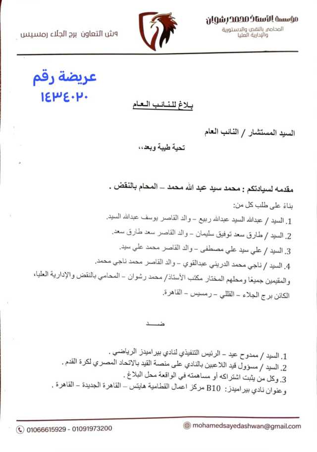 كلمات دلالية: بيراميدز بلاغ النائب العام ممدوح عيد محمد رشوان نادی بیرامیدز على أن