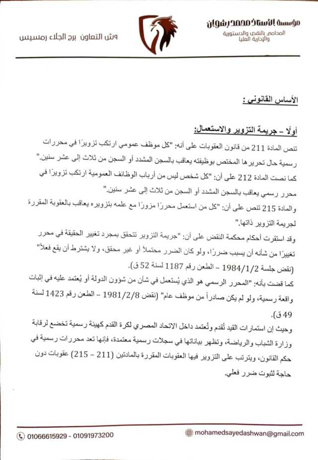 وأضاف رشوان حيث إن استمارات القيد تقدم وتُعتمد داخل الاتحاد المصري لكرة القدم كهيئة رسمية تخضع لرقابة وزارة الشباب والرياضة، وتظهر بياناتها في سجلات رسمية معتمدة، فإنها تعد محررات رسمية في حكم القانون، ويترتب على التزوير فيها العقوبات المقررة بالمادتين (211 - 215 عقوبات دون حاجة لثبوت ضرر فعل.