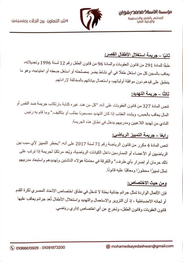 وحصل أبناء المبلغين جميعا على مستند رسمي من الاتحاد المصري لكرة القدم بتاريخ 27 / 8 /2024 يفيد بأنه لاعب حر وغير مقيد على قوائم نادي بيراميدز، ثم فوجئ لاحقا بقيده في سجلات الاتحاد على قوائم النادي ذاتها، وهو ما يعد دليلا دامغًا على وقوع جريمة التزوير والاستعمال من قبل المشكو في حقهم.