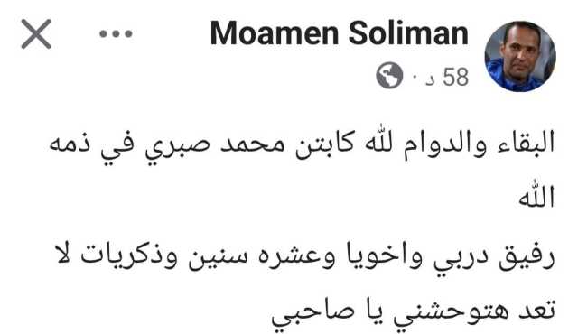 “البقاء والدوام لله… كابتن محمد صبري في ذمة الله. رفيق دربي وأخويا وعِشرة سنين وذكريات لا تُعد… هتوحشني يا صاحبي.”