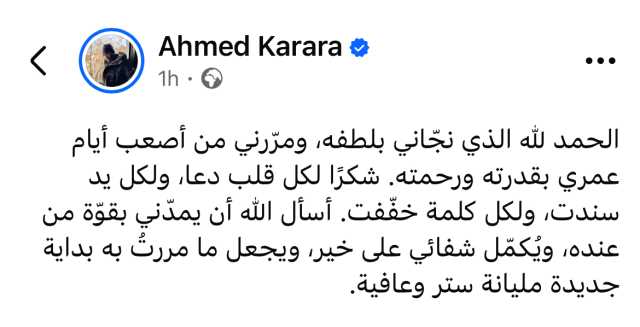 وقال أحمد كرارة في منشور عبر فيسبوك: الحمد لله الذي نجّاني بلطفه، ومرّرني من أصعب أيام عمري بقدرته ورحمته. شكرًا لكل قلب دعا، ولكل يد سندت، ولكل كلمة خفّفت. أسأل الله أن يمدّني بقوّة من عنده، ويُكمّل شفائي على خير، ويجعل ما مررتُ به بداية جديدة مليانة ستر وعافية.