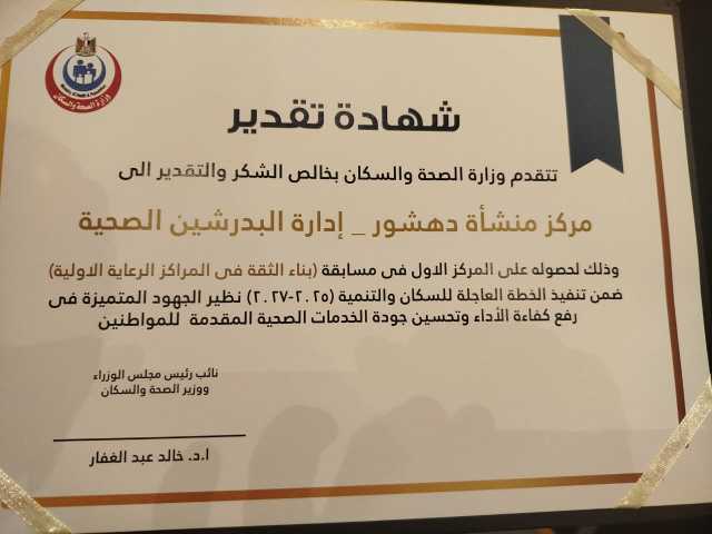 الجيزة: حصول منشأة دهشور على المركز الأول في مسابقة بناء الثقة للرعاية الأولية